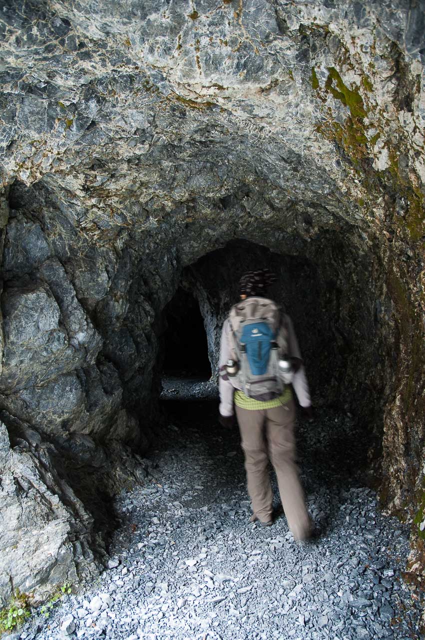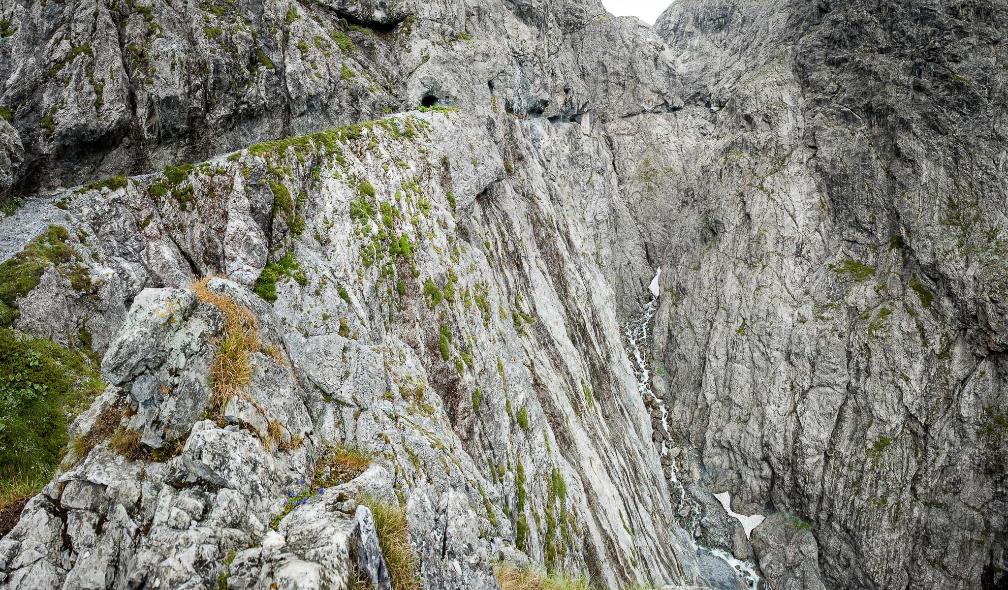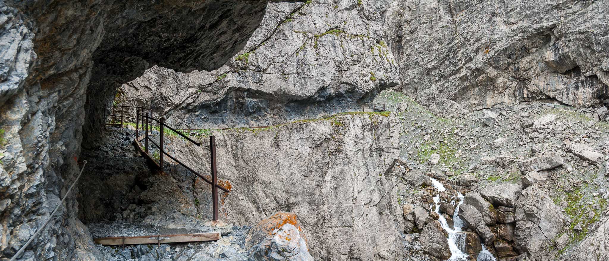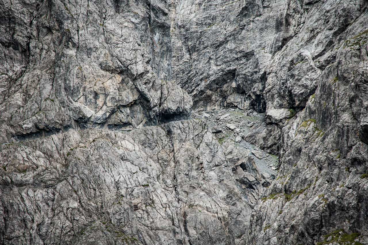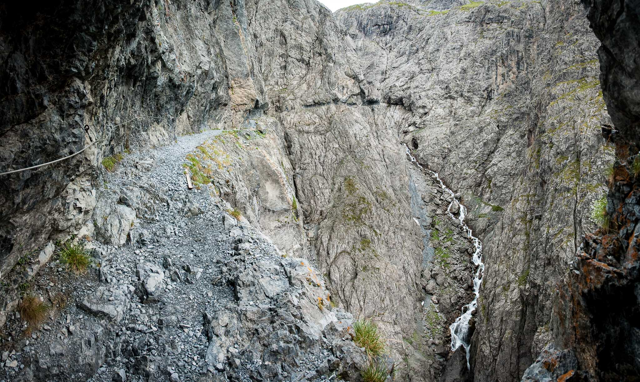 Der Steig ist zur Linken (Schlucht) mit einem Geländer und zur Rechten (Felswand des Piz da Gliasen) mit einem Drahtseil gesichert, sodass sogar die beste Ehefrau von allen keinen Anflug von Nervosität zeigt. Sie hat ein anderes Problem: Sie hat zu kalt!