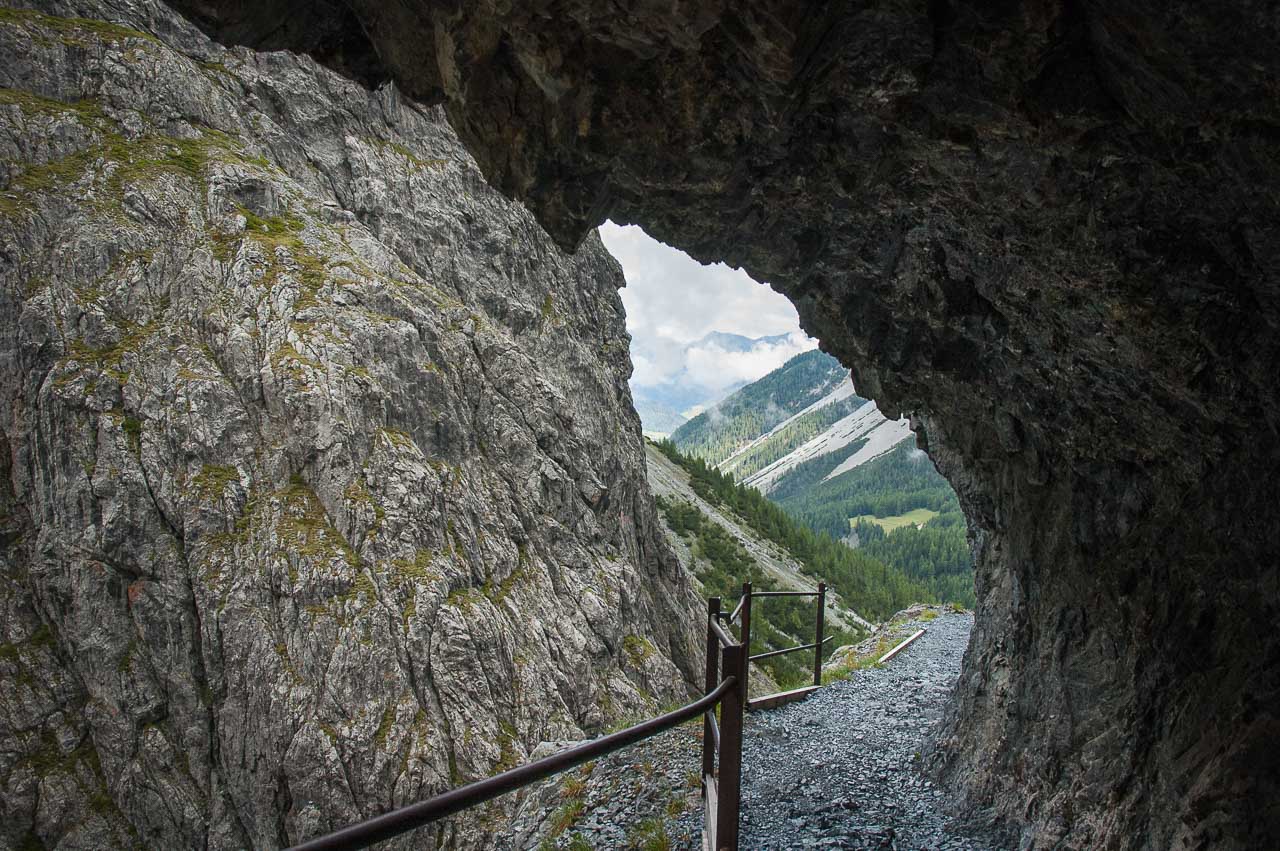 Zwei kurze Stollen, urplötzlich erhellt sich das Tal und wir können in das schöne Seitental Uina des Unterengadins blicken.