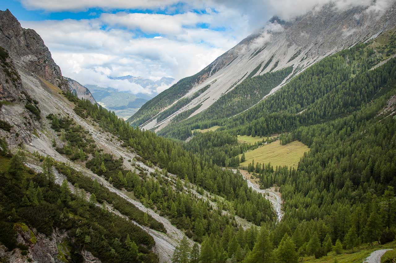 Der Schlinigpass ist eine Wasserscheide. Glück haben diejenigen Wassertropfen, die nach Osten fließen und über die Etsch in der warmen Adria enden. Pech ihre Kollegen, die nach Westen durch die Uina Schlucht hindurch fließen, um über den Inn und die Donau im Schwarzen Meer zu landen.