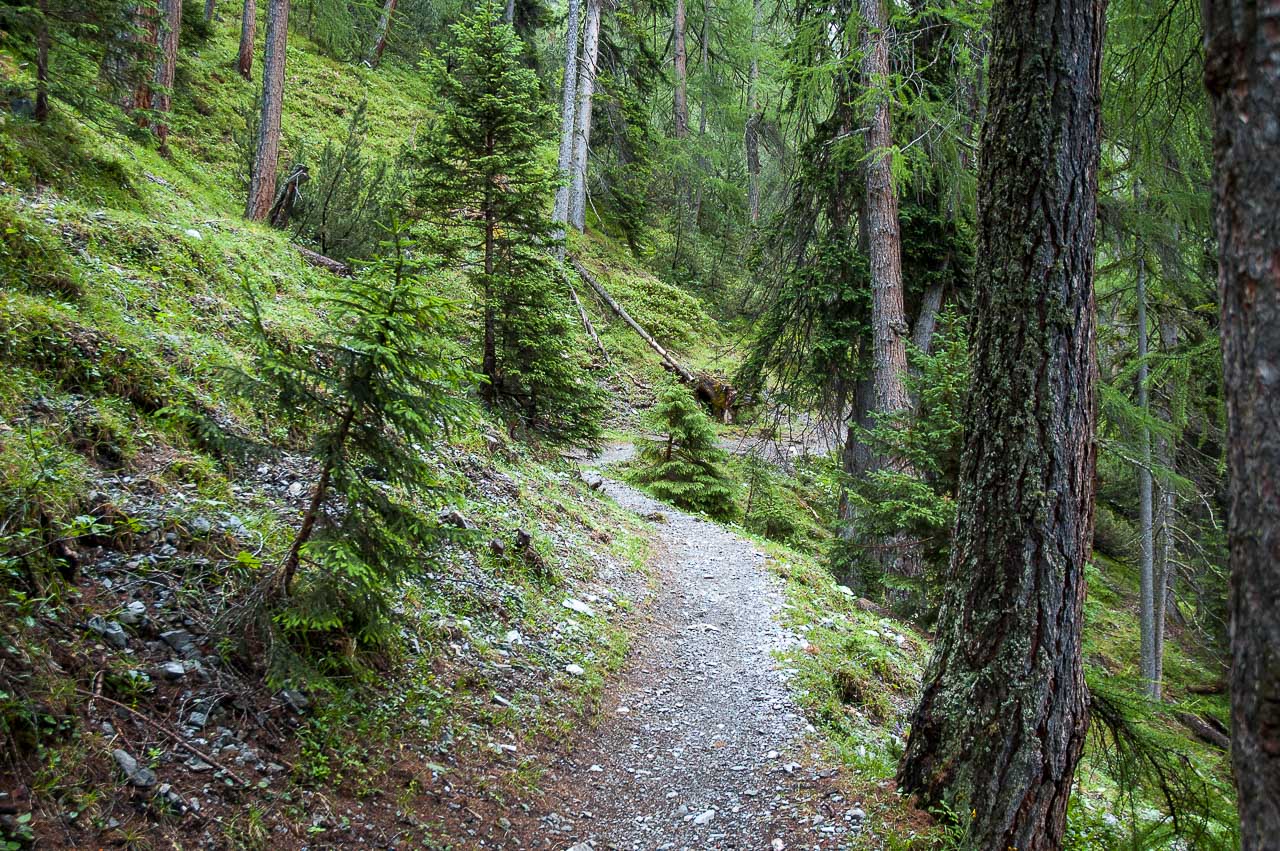 Ein kurzer Abstieg, dann führt uns ein Waldpfad nur mehr leicht abwärts bis zum ersten Hof, dem Uina Dadaint.