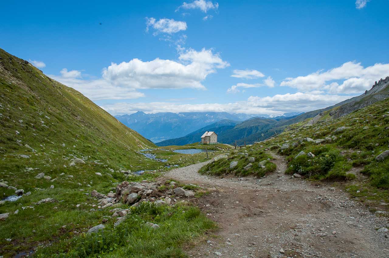 Endlich blickt die Sonne hinter der letzten Wolke hervor. Die beste Ehefrau von allen ist entzückt. Einkehr in der Sesvenna Hütte oder doch lieber hinunter bis zur Schlinig Alm? Natürlich will die beste Ehefrau von allen runter bis zur Schlinig Alm, denn dort wird es sicherlich wärmer sein.