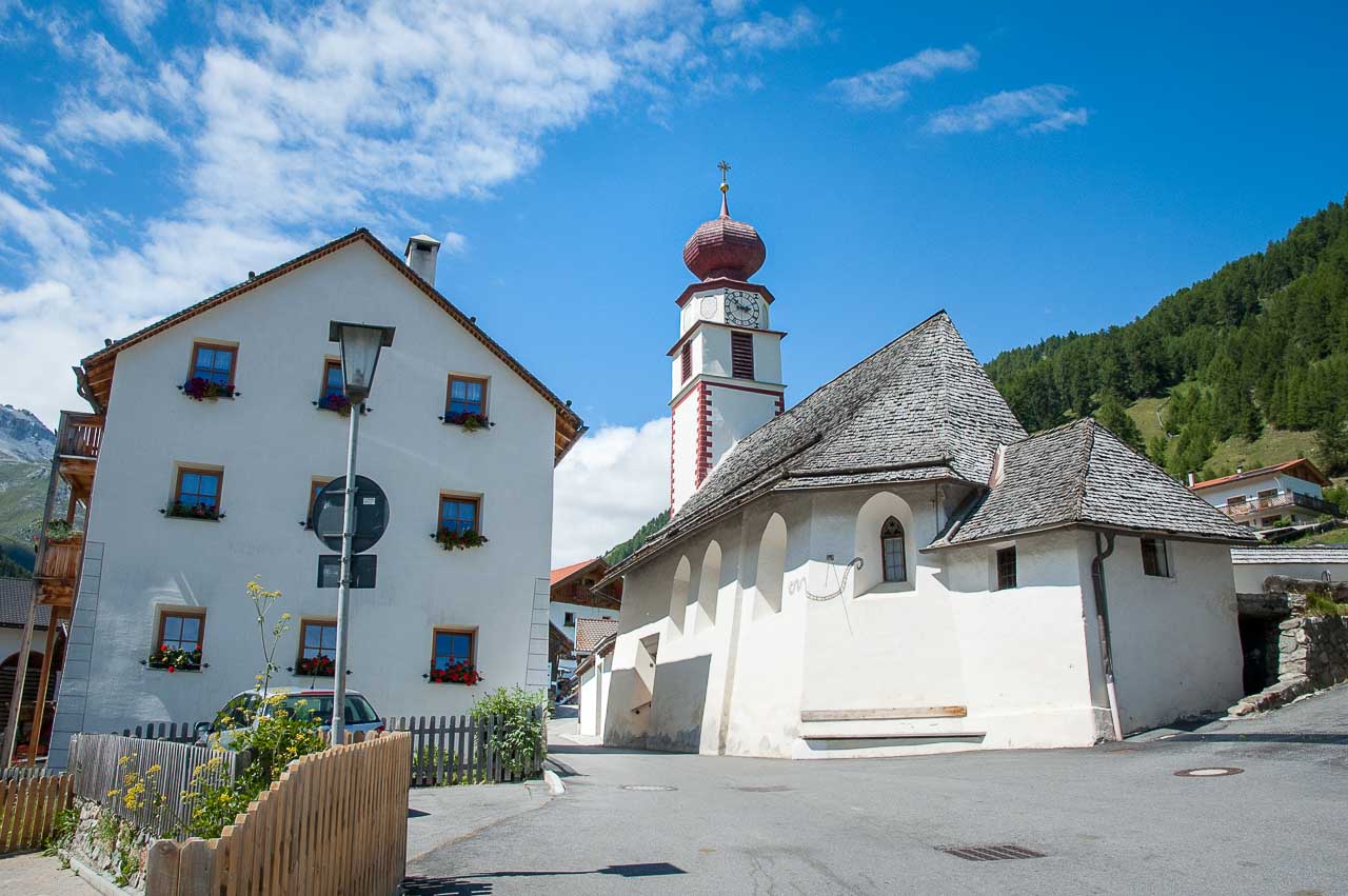 Um 9.45 Uhr starten wir auf 1.740 m vor der Kirche in Schlinig bei 13°, gefühlten 10°, mit Wolken behangenem Himmel, begleitet von einer kalten und recht starken Brise. Entlang der asphaltierten, einspurigen Straße geht es über die Schliniger Alm zur Sesvenna Hütte empor. Die Beschilderung in Schling hat 2,5 Stunden veranschlagt. Mal schauen…
