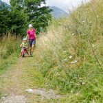 Anna ist immer noch auf ihrem Laufrad. Wie bei Kleinkindern so üblich konzentriert sie sich wenig aufs fahren und schaut während des Fahrens in allen Richtungen. Ihr ist nicht entgangen, dass sich unten in Kuppelwies, hinter dem Parkplatz der Schwemmalm Umlaufbahn ein Spielplatz befindet. Es hilft nichts, wir müssen nun den steilen Weg hinunter zum Spielplatz.