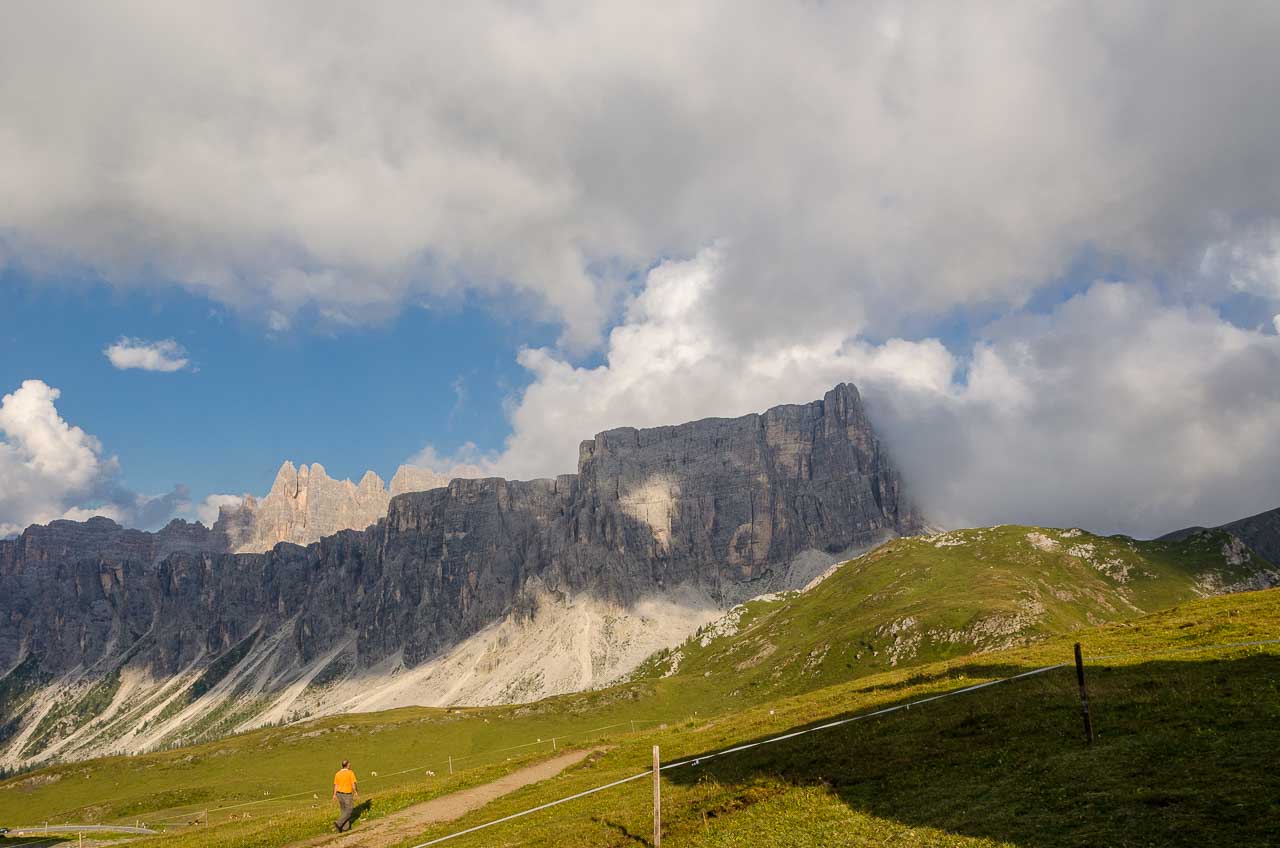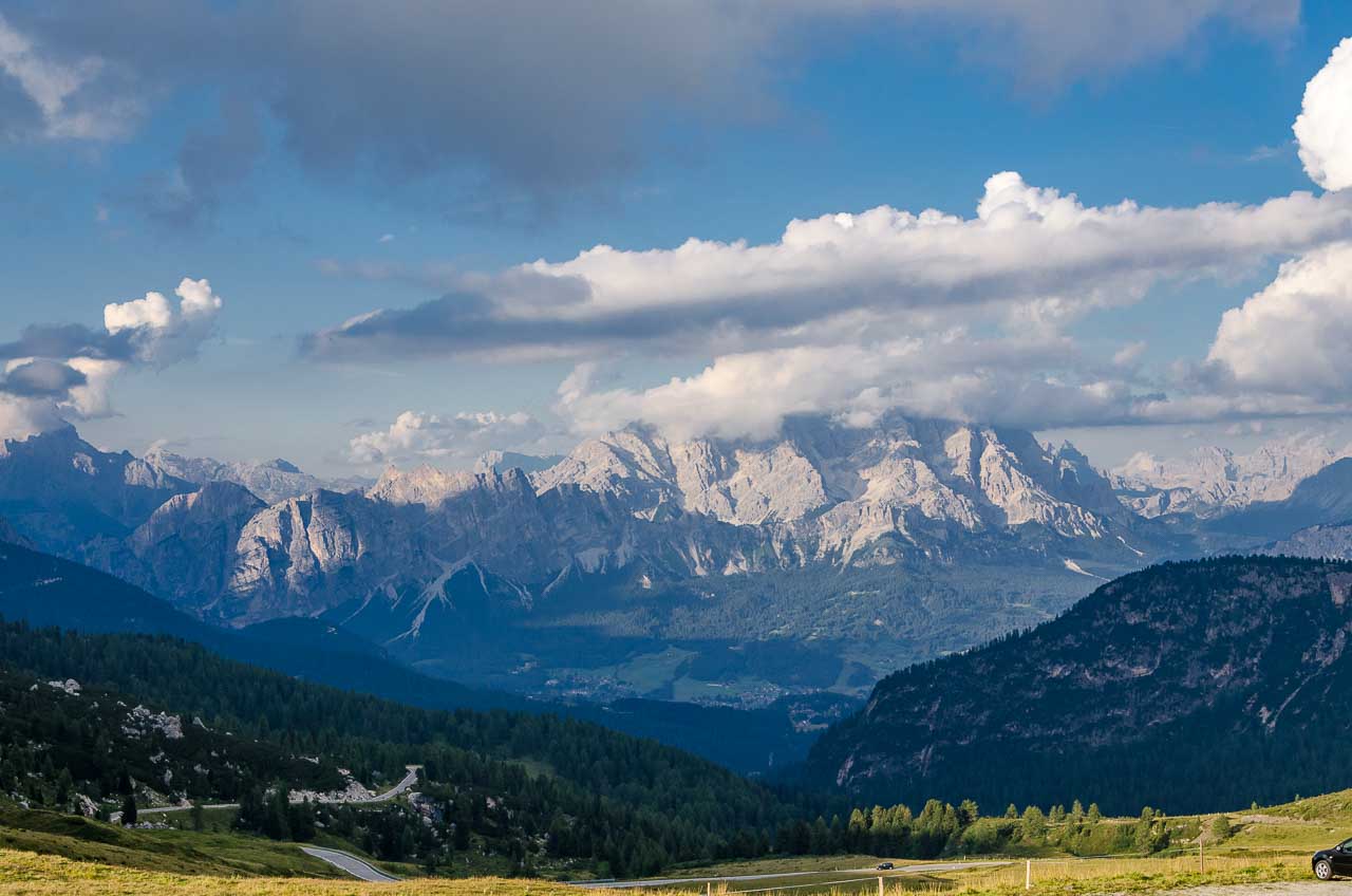 Vorbei ist nach der Civetta Tour unser erster Dolomiten-Ferientag noch nicht. Es heißt noch bis nach Sexten zu fahren. Wir entscheiden uns für den Passo Giau. In etlichen Kurven fahren wir auf 2.236 m Meereshöhe hinauf. Das Gelände kommt mir irgendwie bekannt vor. Erst am Pass oben, bei einem Fotografie-Intermezzo, fällt mir ein, dass wir vor einigen Wochen ganz in der Nähe gewesen sind. Wir befinden uns östlich des Monte Nuvolau, den wir bei unserer Cinque Torri Rundwanderung bestiegen haben.