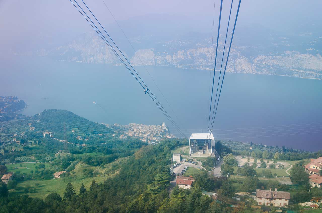 Es stellt sich heraus, dass die Seilbahn Monte Baldo in zwei Abschnitte unterteilt ist. Die erste, riesige Seilbahn mit 1.512 m Länge und 463 m Höhenunterschied bringt uns von Malcesine hinauf zur Fraktion S. Michele und begeistert dabei mit Tiefblicken hinunter nach Malcesine und natürlich zum Gardasee. Dann heißt es umsteigen in die erwartete drehbare Panoramakabine der zweiten Seilbahn, welche uns mit 2.813 m Länge, 1.187 m Höhenunterschied und einer vollen 360° Drehung hinauf auf den Monte Baldo bringt