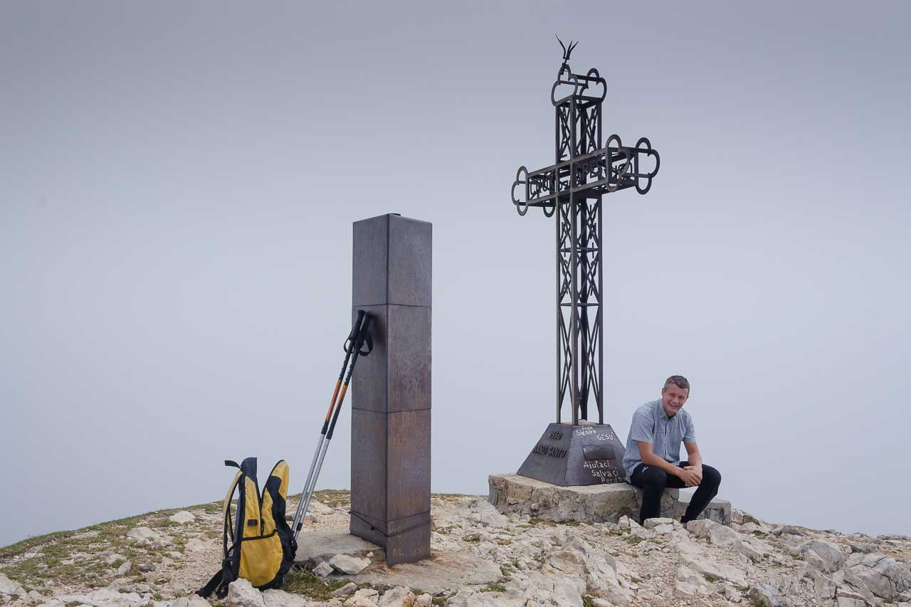 Am Gipfelkreuz der Punta Telegrafo hoch über den Gardasee