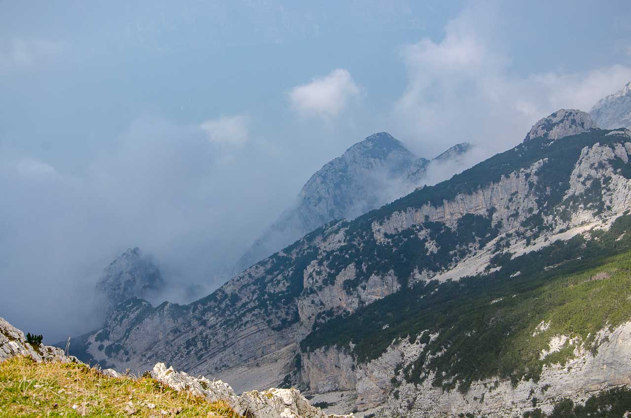 Der Nebel ist halb so schlimm wie er von oben ausgeschaut hat. Zumindest drei bis vier Meter haben wir Sicht, was das Wandern nicht wesentlich erschwert. Der Steig wird aber zunehmend ausgesetzter und schwieriger, an einigen Stellen sogar für Trittunsichere sehr gefährlich. Ich wundere mich etwas, denn normalerweise bin ich mit den Kompass Karten sehr zufrieden.