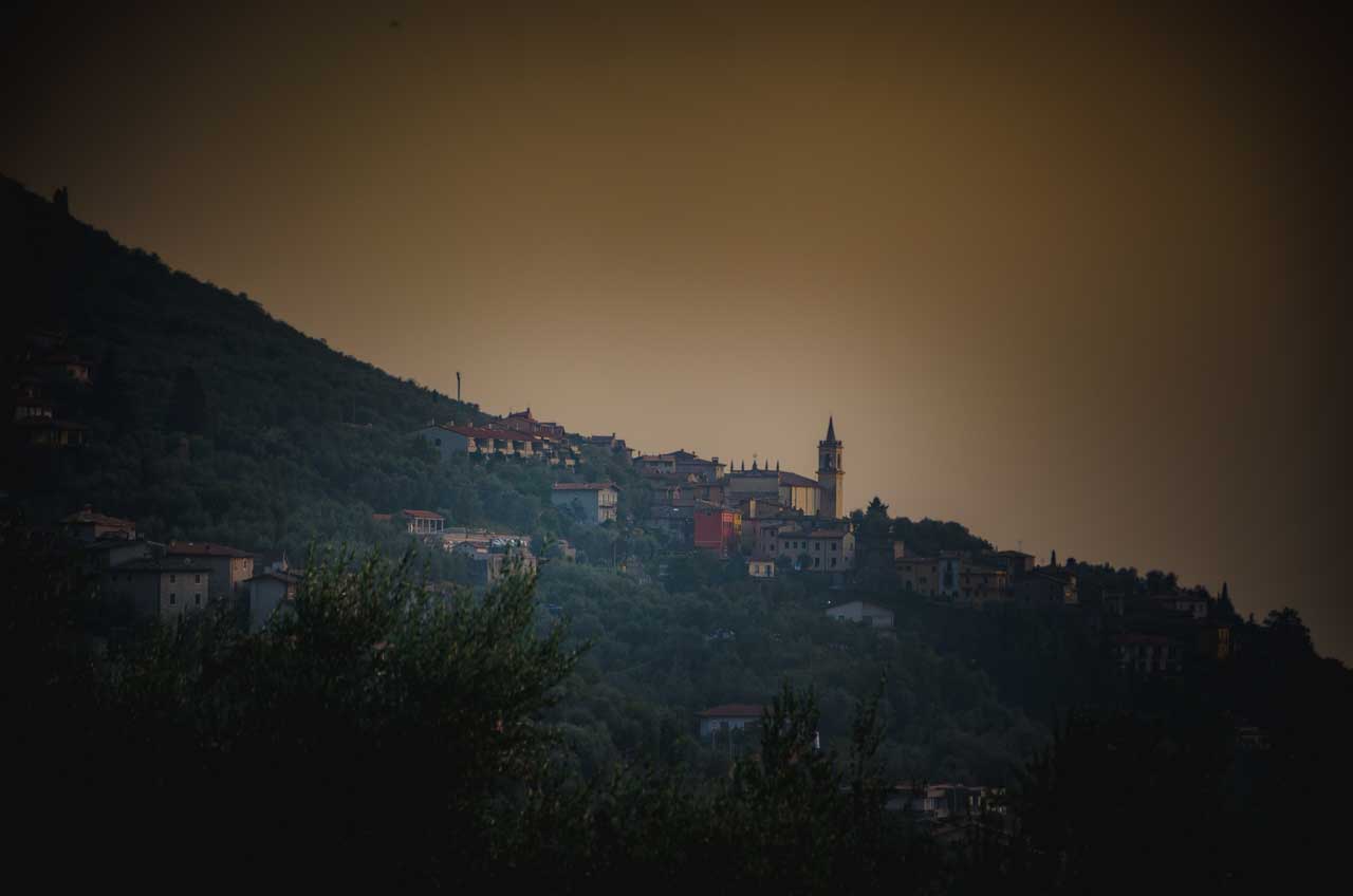 Während die Sonne über den Gardasee Bergen untergeht wandern wir gemütlich circa eine Stunde lang zurück bis zum Parkplatz unter der Talstation der Monte Baldo Seilbahn in Malcesine.