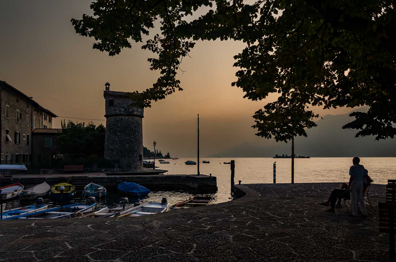Vor uns liegt das Dörfchen Sommavilla. Nun heißt es nur noch entlang des Gardasee-Ostufers 6 km bis nach Malcesine zurück gehen. Die Uferpromenade ist natürlich flach, das macht meinem Knie keine Probleme, sodass ich wieder wie ein normaler Mensch vorwärts gehen kann.