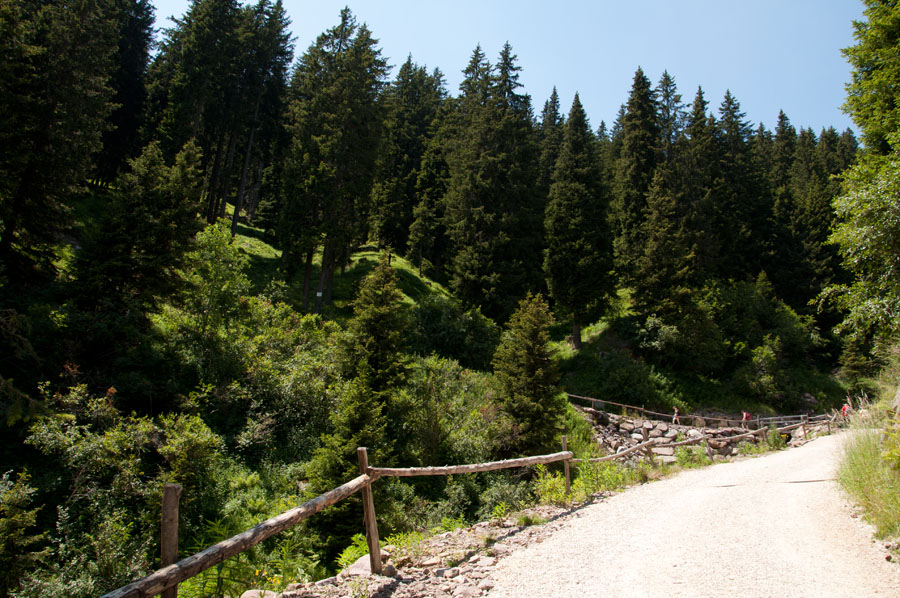 So geht’s zuerst ein kleines Stück die Straße zum Gampenpass entlang, bevor wir links auf den geschotterten Forstweg abbiegen, der uns zur Laugenalm bringen wird. Parallel zur Forststraße verläuft im Wald der Steig zur Laugenspitze über den man auch zur Laugenalm gelangt.