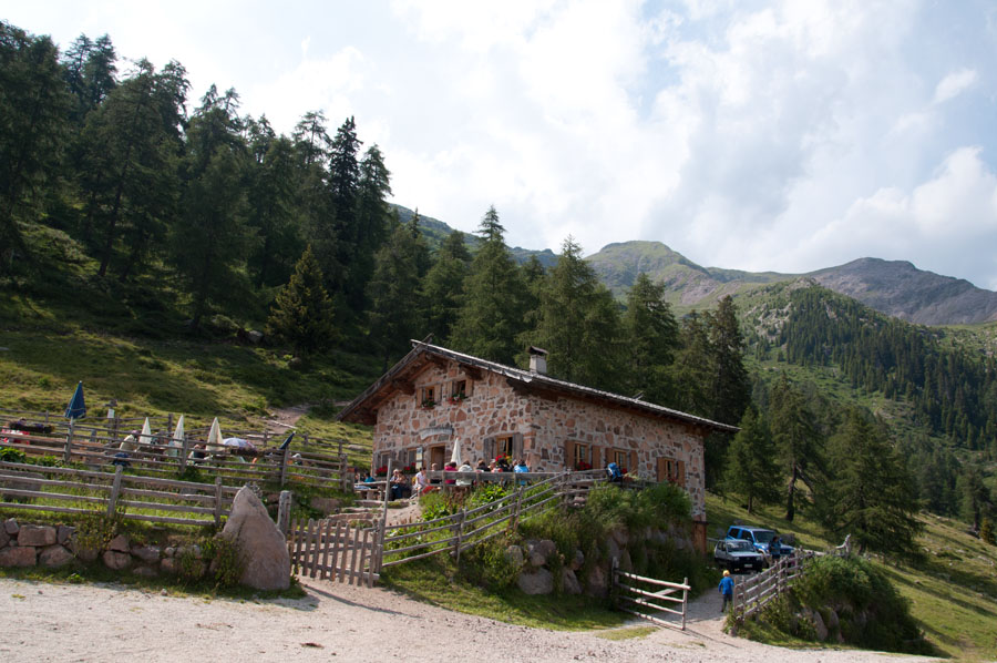 Am Pass angekommen zeigt sich, diese Idee hatten heute scheinbar viele Menschen. Kein Zollbreit mehr Platz, um ein Auto abzustellen. Ist aber eigentlich auch kein Wunder, ist doch der Pass idealer Ausgangspunkt für die Wanderungen zur Laugenspitze, zum Schöneck, zum Felixer Weiher (Lago di Tret), hinunter nach Platzers oder nach Mitterbad im Marauntal (Ultental). Also umgekehrt und ein ganzes Stück unterhalb des Passes geparkt.