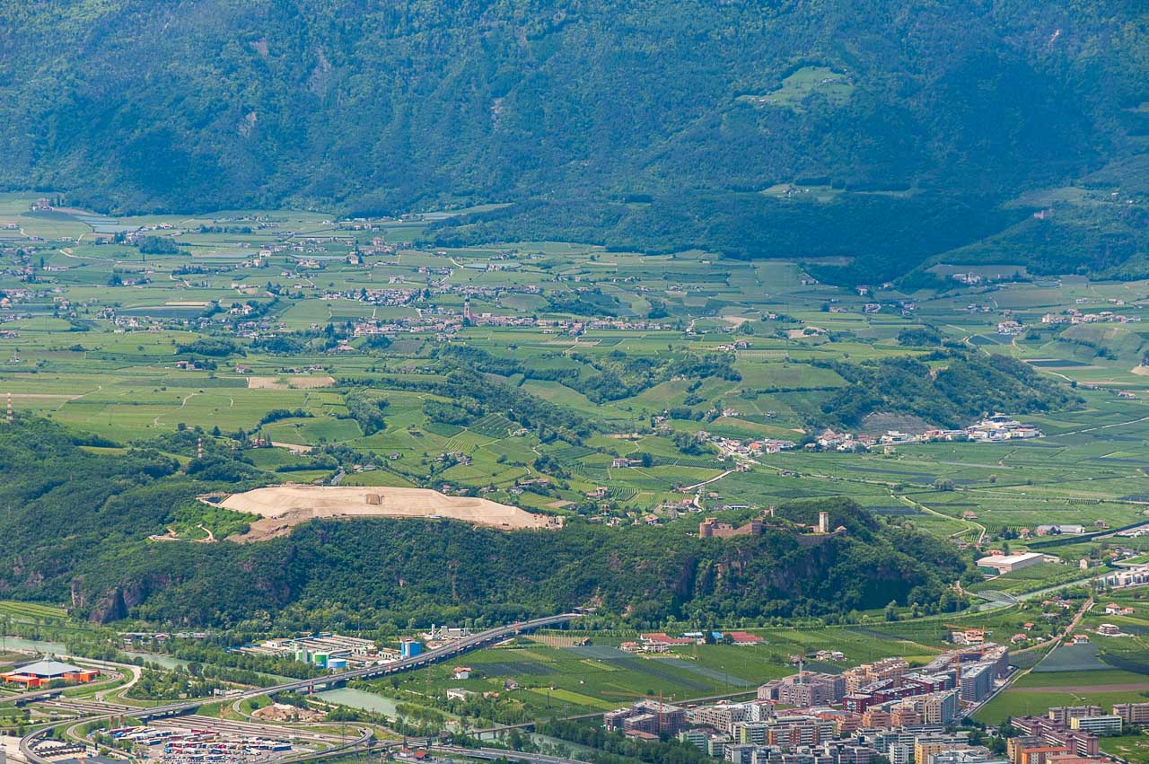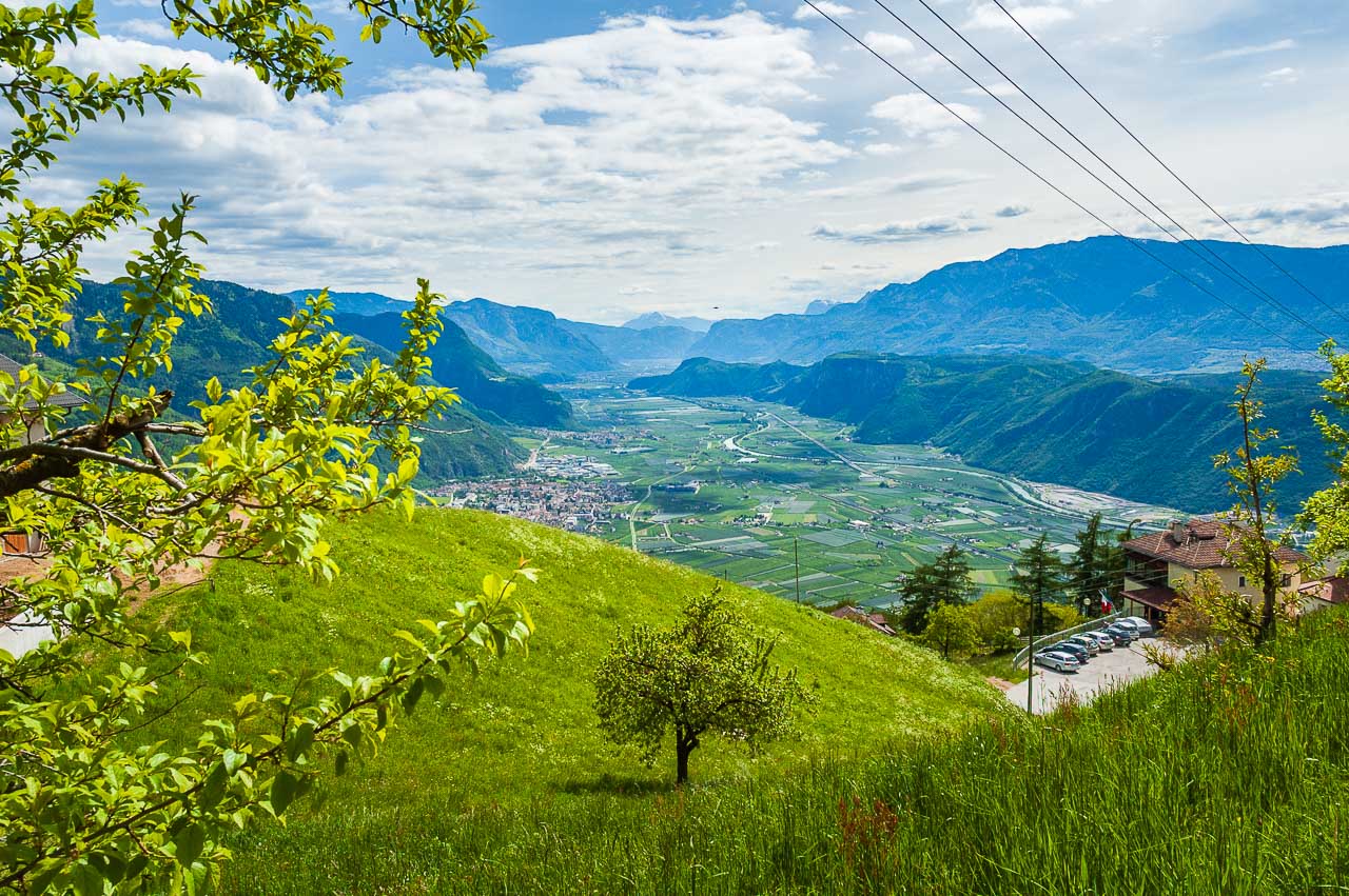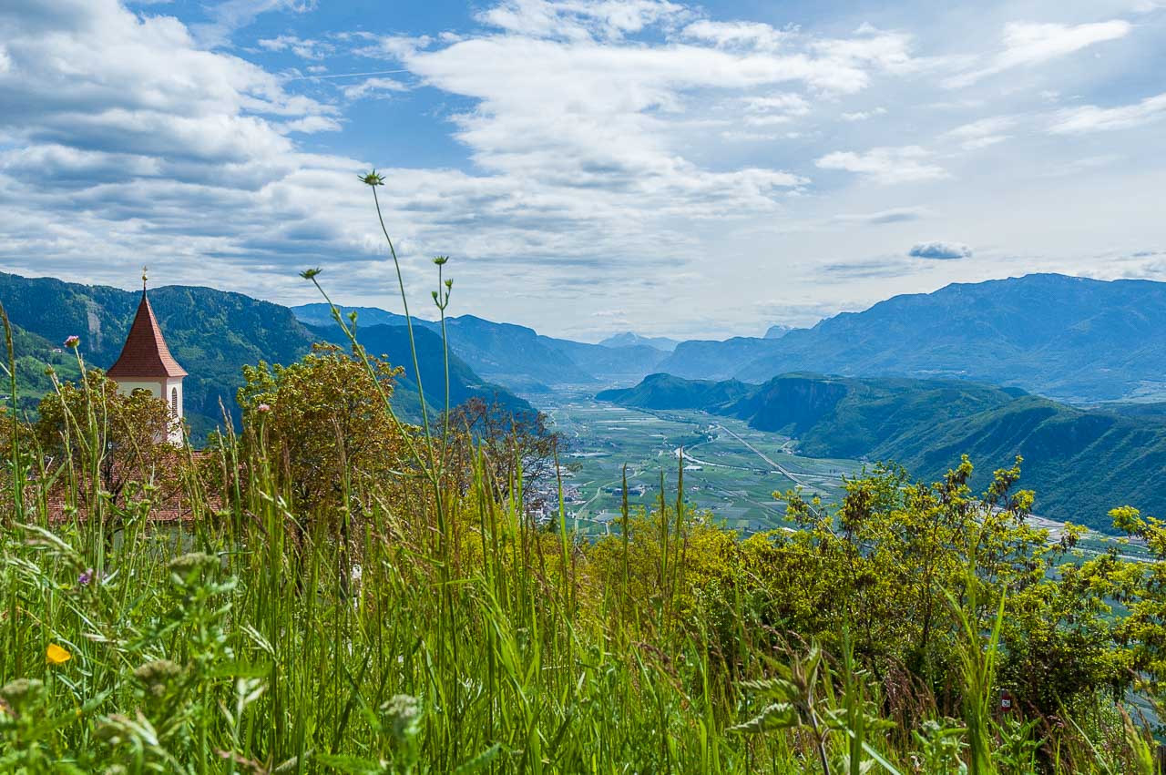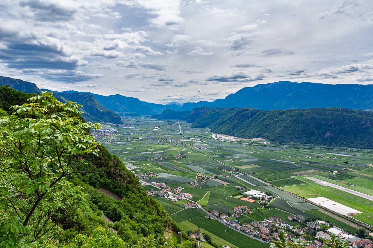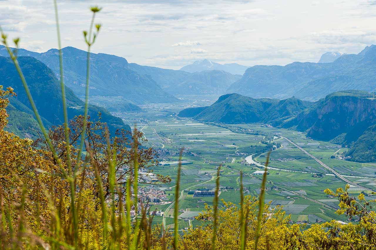 Es ist ein schöner Weg mit Aussicht auf das Bozner Unterland, das von Leifers bis nach Branzoll reicht. Die Etsch schlängelt sich durch das Tal und rechts flankieren der Mitterberg mit Sigmundskron und der Montiggl das Panorama.