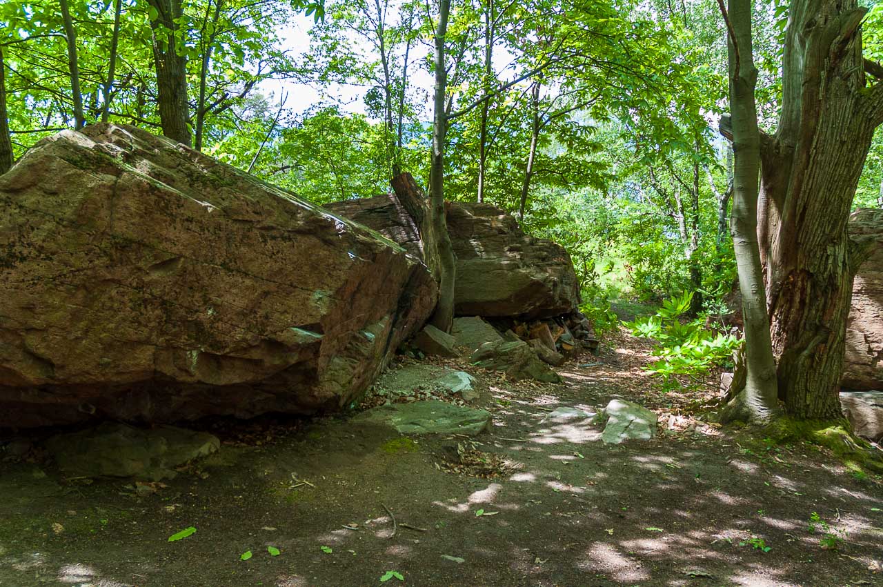 Wir befinden uns auf Porphyr-Untergrund. Ab und zu gibt der Weg den Blick auf den südlichen Teil von Bozen frei. Wir kommen an ein, zwei kleinen Bildstöcken vorbei und an einer Lichtung mit drei, vier riesigen Porphyrblöcken, die eindrucksvoll wie Zyklopen hier rumstehen.