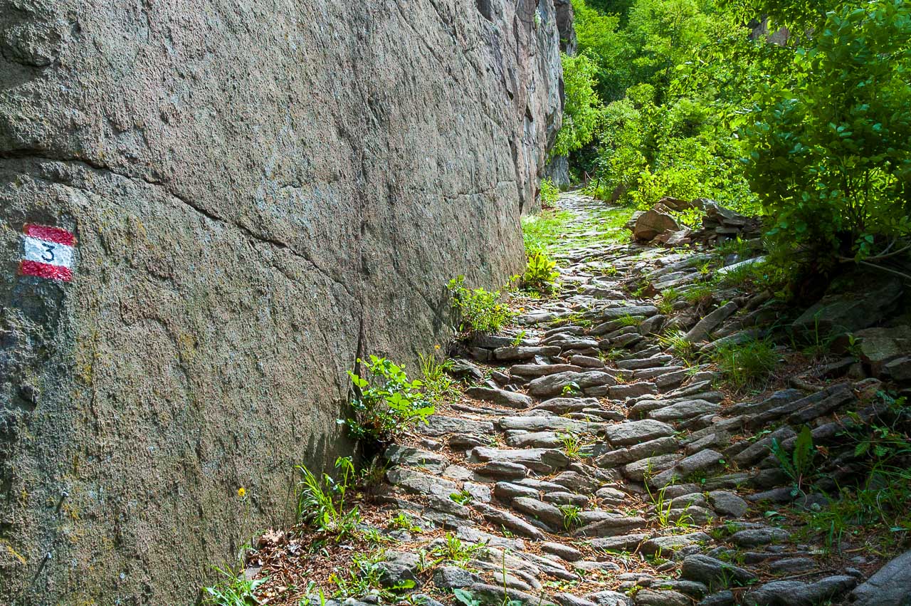 Von der Haselburg aus geht es nun in südlicher Richtung dem Bergdorf Seit entgegen. Wir sind überrascht, dass auch hier der Steig mit Steinen gepflastert ist. Nicht, dass wir uns falsch verstehen, keine Pflasterung wie in der Stadt, sondern mit den hier vorkommenden Natur-Porphyrsteinen. Also ein Weg, bei dem man bei jedem Schritt gut aufpassen muss, nicht zu stolpern oder auszurutschen.