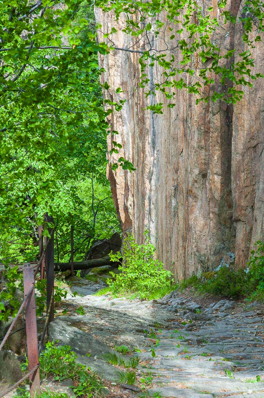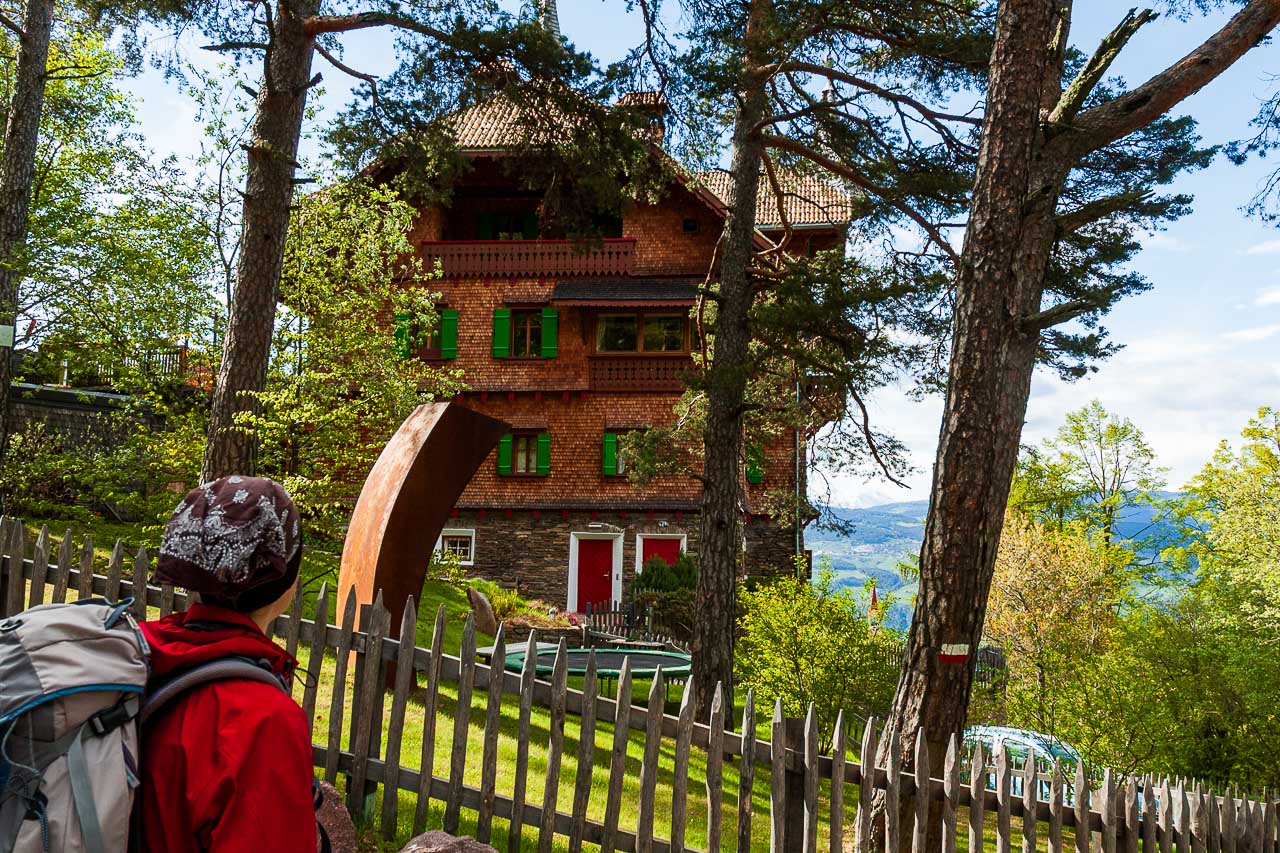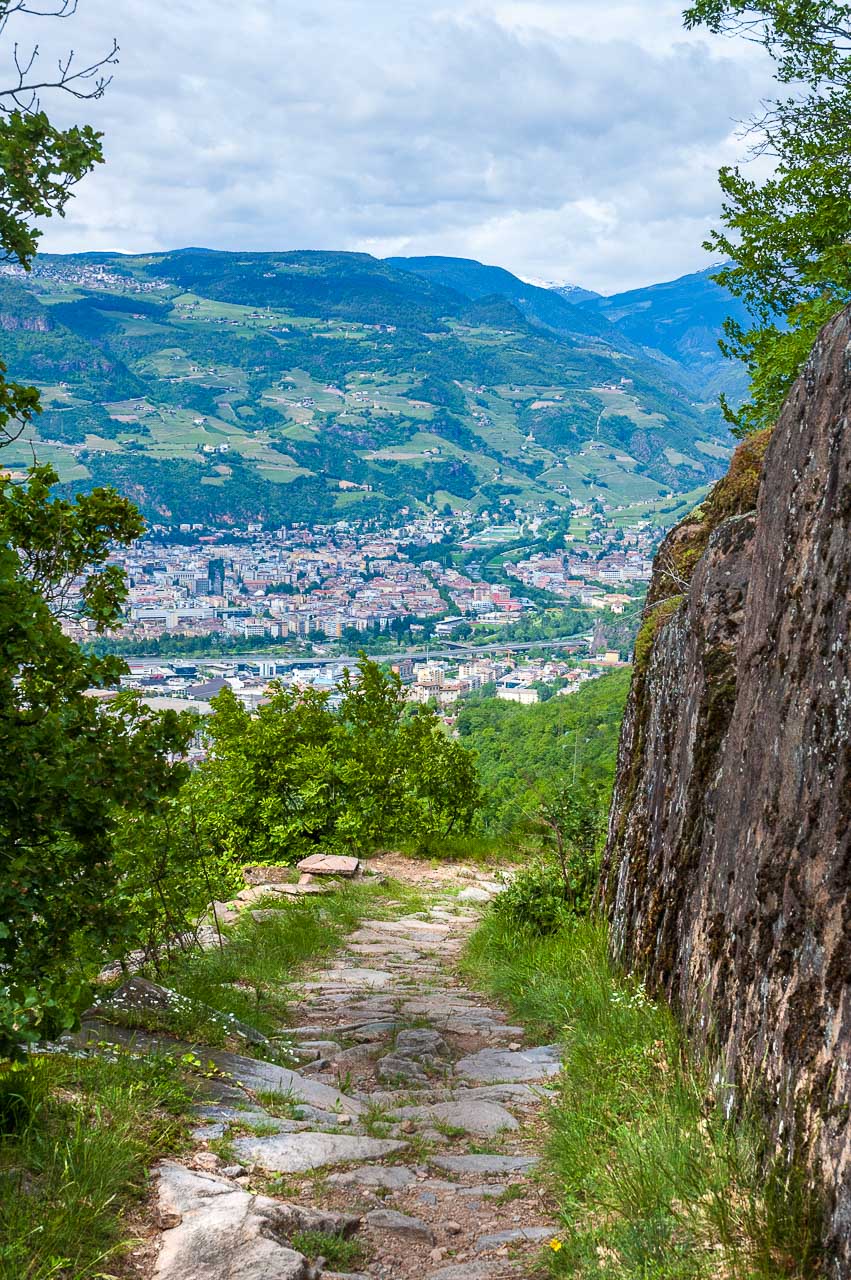 Unterhalb der mächtigen Porphyrwände führt uns ein circa zwei Meter breiter und mit einem Geländer gesicherter Steig, der teilweise ausgesetzt ist, oberhalb von Bozen an einer im Felsen eingemauerten Kapelle vorbei in Richtung Seit und Brantental.