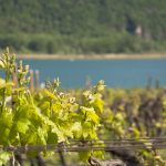 Der blaue Kalterer See funkelt durch das frische Grün der gerade erst gesprossenen Rebentriebe herauf.