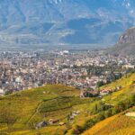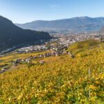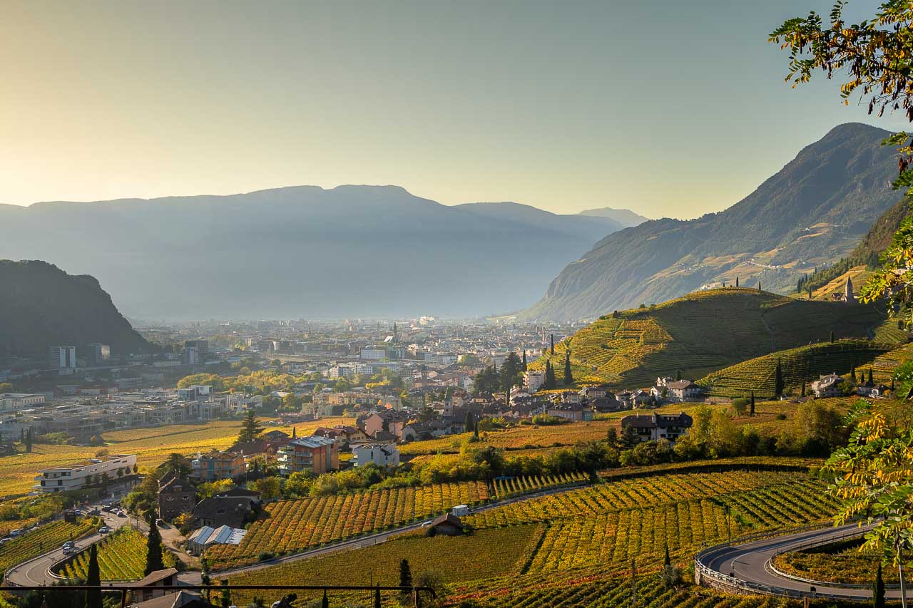 Nach 800 Wandermetern, immer mitten durch die Weinberge, überqueren wir die Rittner Straße und steigen zum Kirchlein St. Justina auf. Hier biegen wir 90 Grad nach rechts ab – der Themenweg ist durchgehend gut beschildert – und wandern genussvoll durch goldgelbe Weinberge, nun etwas bergauf und erreichen die Oberleitacher Straße. Auch diese wenig befahrene Straße bietet dem Weinbergwanderer einen atemberaubenden Blick über den Talkessel von Bozen, von Kollern über den Eisack, über die Innenstadt mit dem mächtigen Dom bis hin zum lieblichen Weinhügel St. Magdalena, über den die Gondeln der Rittner Bahn nach Oberbozen schweben. Alles überragt von den Bergen des Mendelkammes.