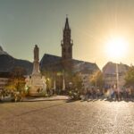 - Dahinter das Zentrum von Bozen und darüber der Mendelkamm.