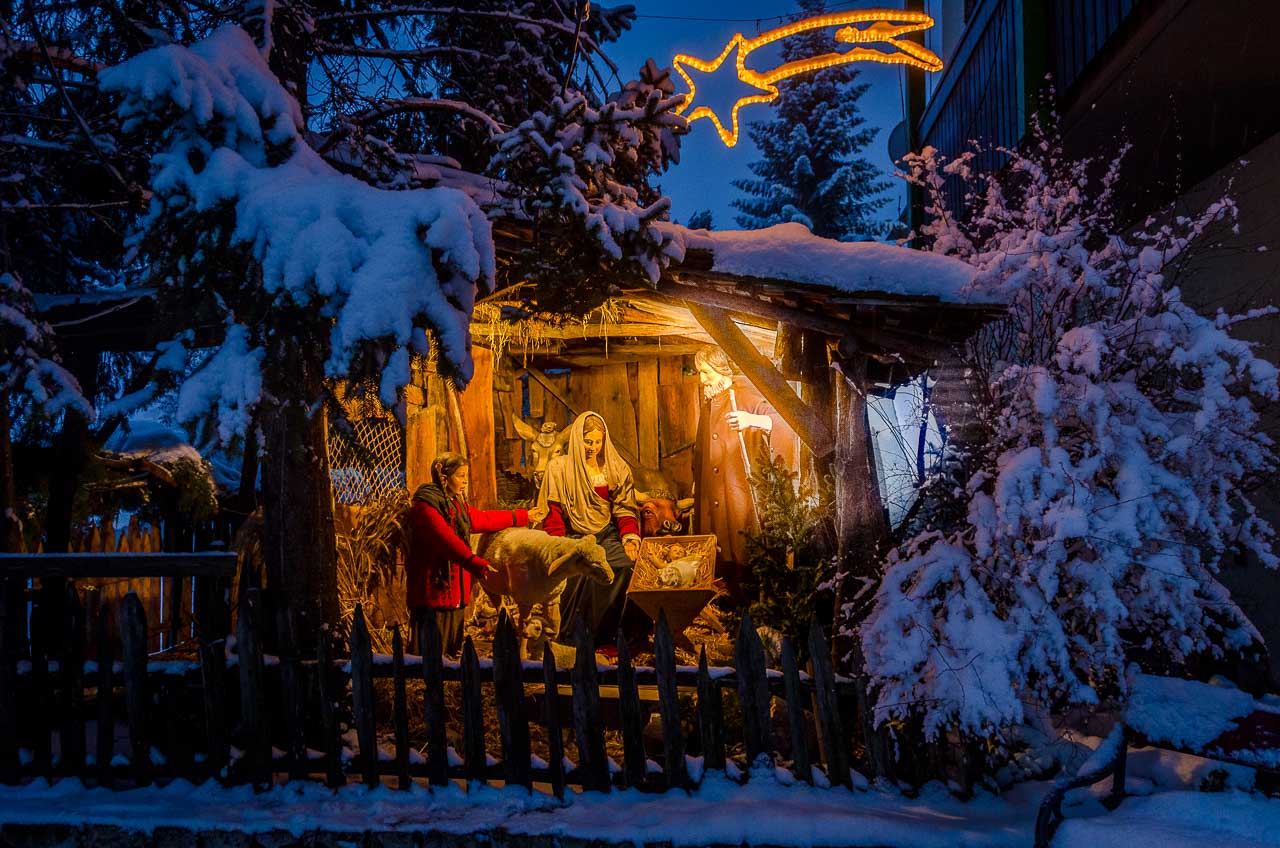 Es dämmert bereits und wieder holt uns das Begleitmotiv der heutigen Winterwanderung ein: Eine menschengroße Krippe schimmert uns entgegen.