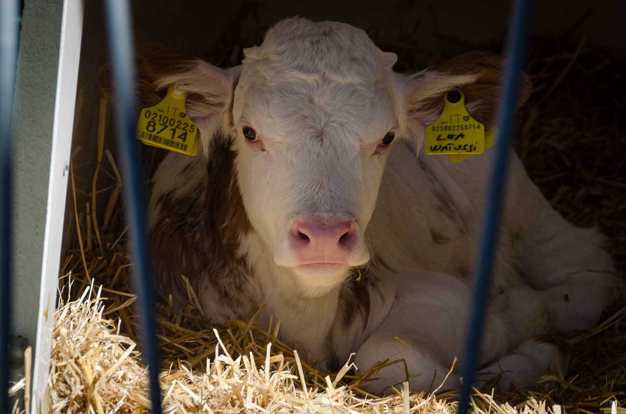 Über den steilen, nur einen Meter breiten, Weg „Alter Almweg“ geht es hinauf zum Wurzerweg, wo die nächste tierische Attraktion wartet. Vor dem Stall des Moarhof bzw. „Maier zu Gassen“-Hof stehen Boxen mit jungen Kälbern. Bearig!